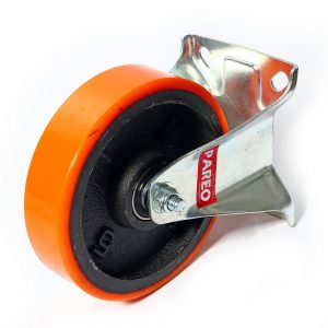 PAREO ล้อโพลียูรีเทนแกนเหล็กหล่อ ทนทานสารเคมี แป้นตาย ขนาด 125MM/5″ รับน้ำหนักได้ 150 KG.