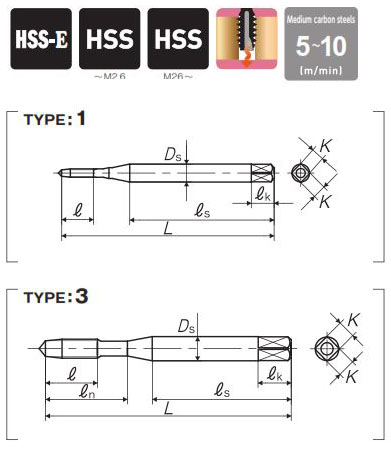 * Suitable for through hole taping of middle carbon steels in low and middle speed tapping area. |