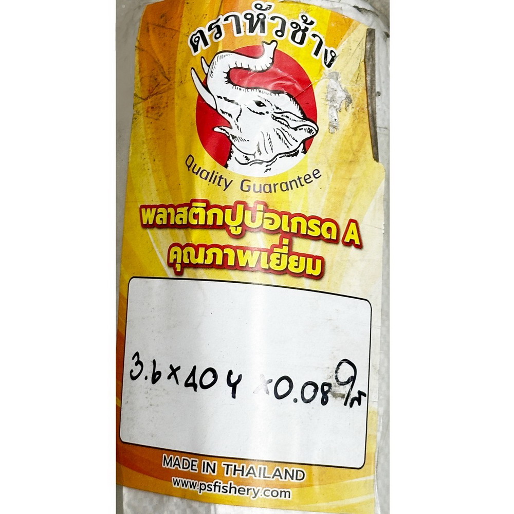• ตราหัวช้าง พลาสติกปูบ่อน้ำ สีใส หนา 0.08 มม. กว้าง 3.6 ม. ยาว 36.6 ม. (40 หลา) ผลิตจากวัตถุดิบ HDPE