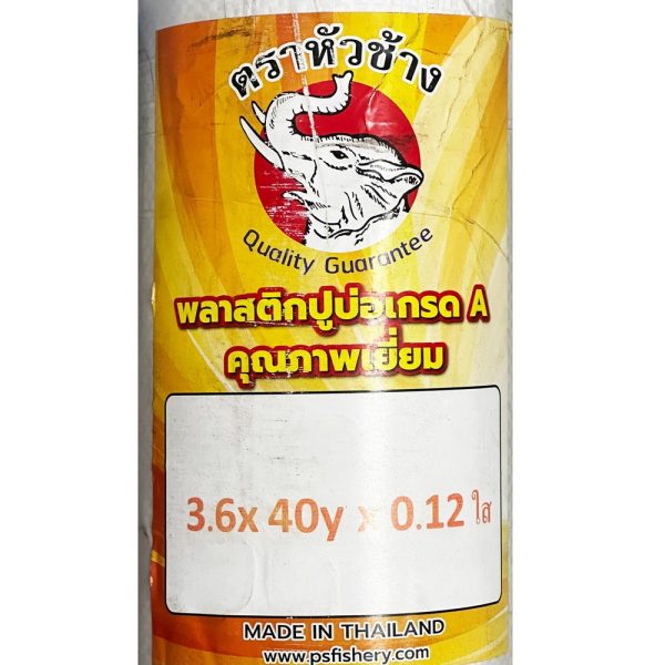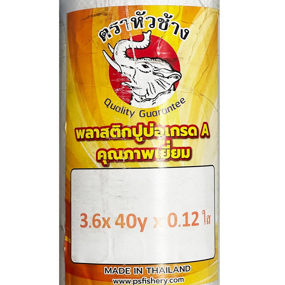 • ตราหัวช้าง พลาสติกปูบ่อน้ำ สีใส หนา 0.12 มม. กว้าง 3.6 ม. ยาว 36.6 ม. (40 หลา) ผลิตจากวัตถุดิบ HDPE