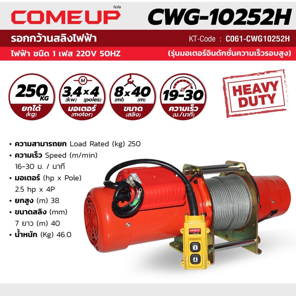 • Come-Up Dlectric Winch” คัมอัพ” รอกกว้านสลิงไฟฟ้า ชนิดไฟฟ้า 1 เฟส 220 V,50Hz