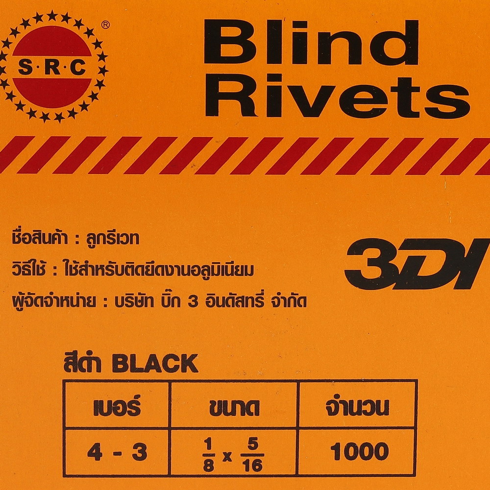 • 3DI ตะปูยิงรีเวท เบอร์ 4-3 ขนาด 3.2 มม. x 8 มม. (1/8 นิ้ว x5/16 นิ้ว)ระยะยืด 3-5 มม. สีดำ(1000 ตัว/กล่อง)