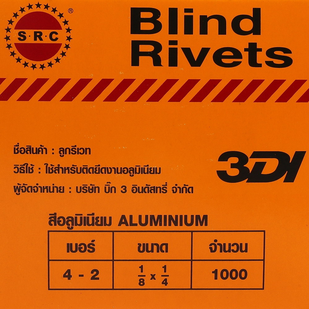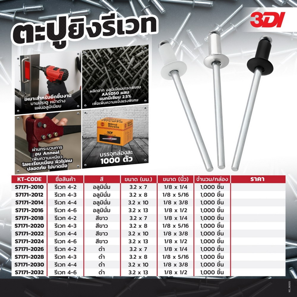 • 3DI ตะปูยิงรีเวท 3DI เบอร์ 4-2 ขนาด 3.2×7 มม. (1/8 นิ้ว x1/4 นิ้ว)ระยะยืด 2-4 มม. สีอลูมิเนียม (1000 ตัว/กล่อง)