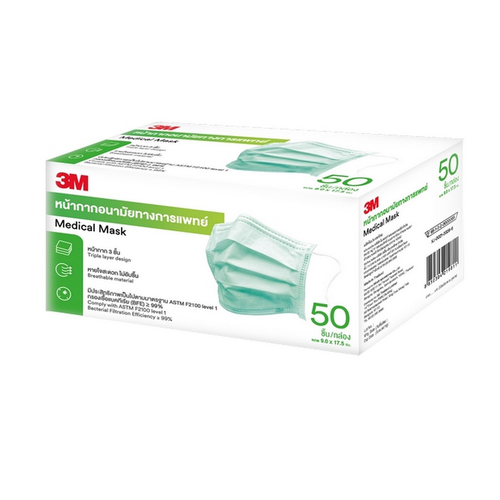 3M หน้ากากอนามัย หน้ากากหนา 3 ชั้น กรองเชื้อแบคทีเรีย (BFE) ได้มากถึง 99% (บรรจุ 50 ชิ้น / กล่อง)