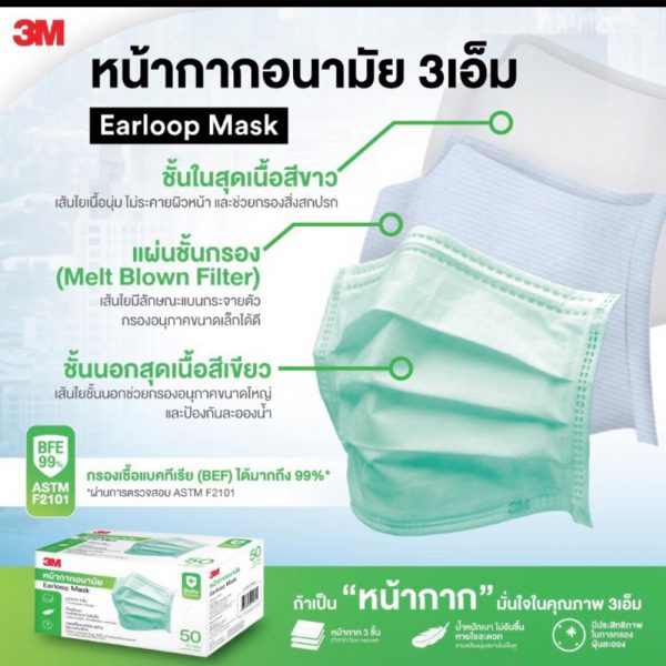 3M หน้ากากอนามัย 3M (3 เอ็ม) หน้ากากหนา 3 ชั้น กรองเชื้อแบคทีเรีย (BFE) ได้มากถึง 99% ผ่านการรับรองมาตรฐาน ASTM F2101 (บรรจุ 50 ชิ้น / กล่อง)