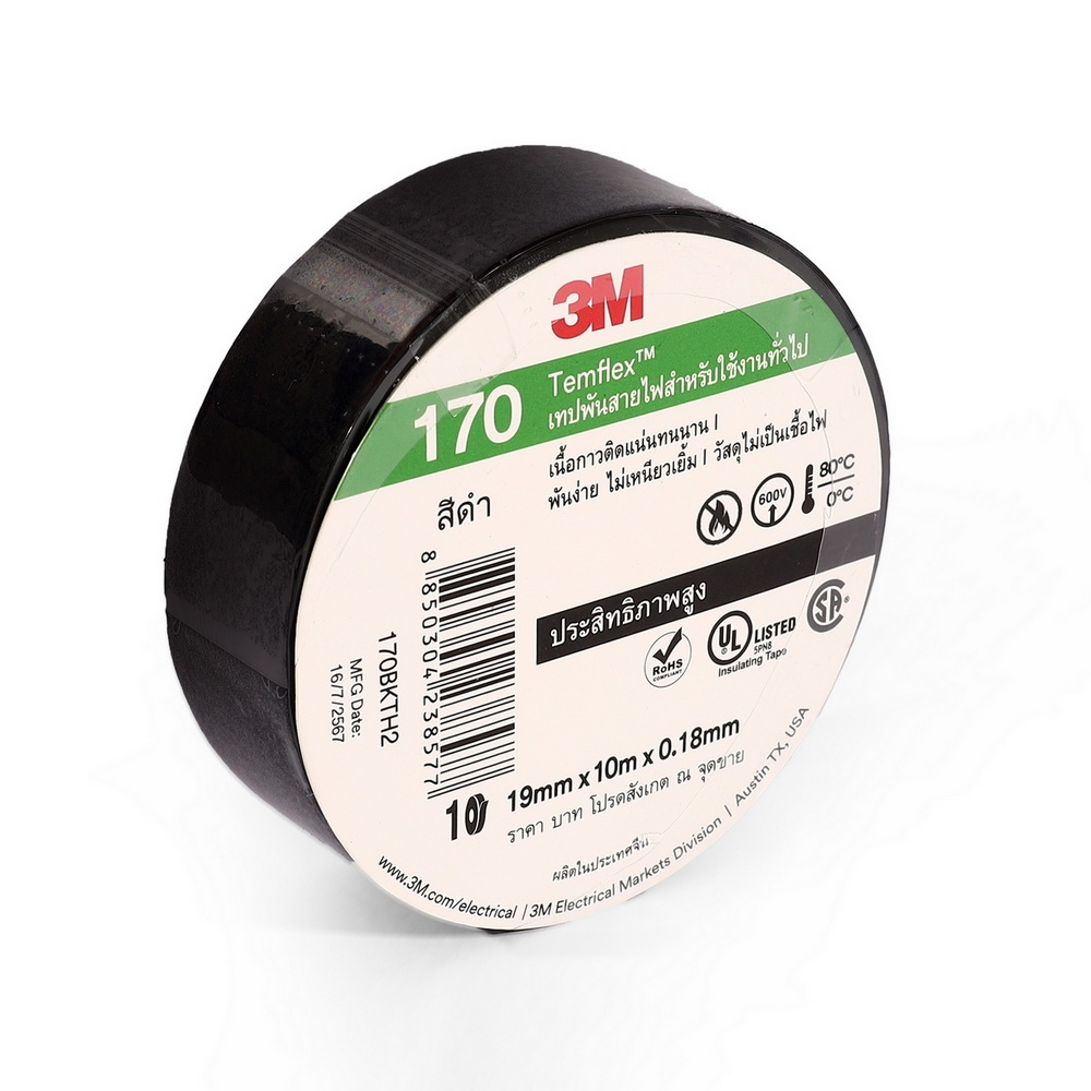 3M เทปพันสายไฟ สีดำ สำหรับใช้งานทั่วไป TEMFLEX 170 ขนาด 19 มม X 10 ม X 0.18 มม. วัสดุไม่เป็นเชื้อไฟ เหมาะสำหรับการใช้งานภายในอาคาร (10ชิ้น)