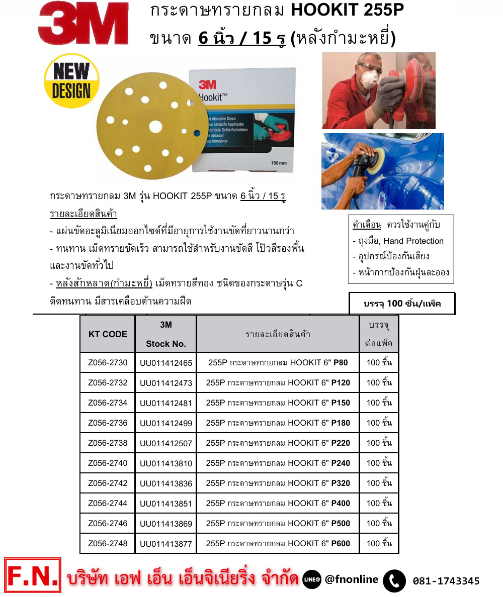 • กระดาษทรายกลม 3M รุ่น HOOKIT 255P ขนาด 6 นิ้ว เบอร์ 80 (มี 15 รู) หลังกำมะหยี่