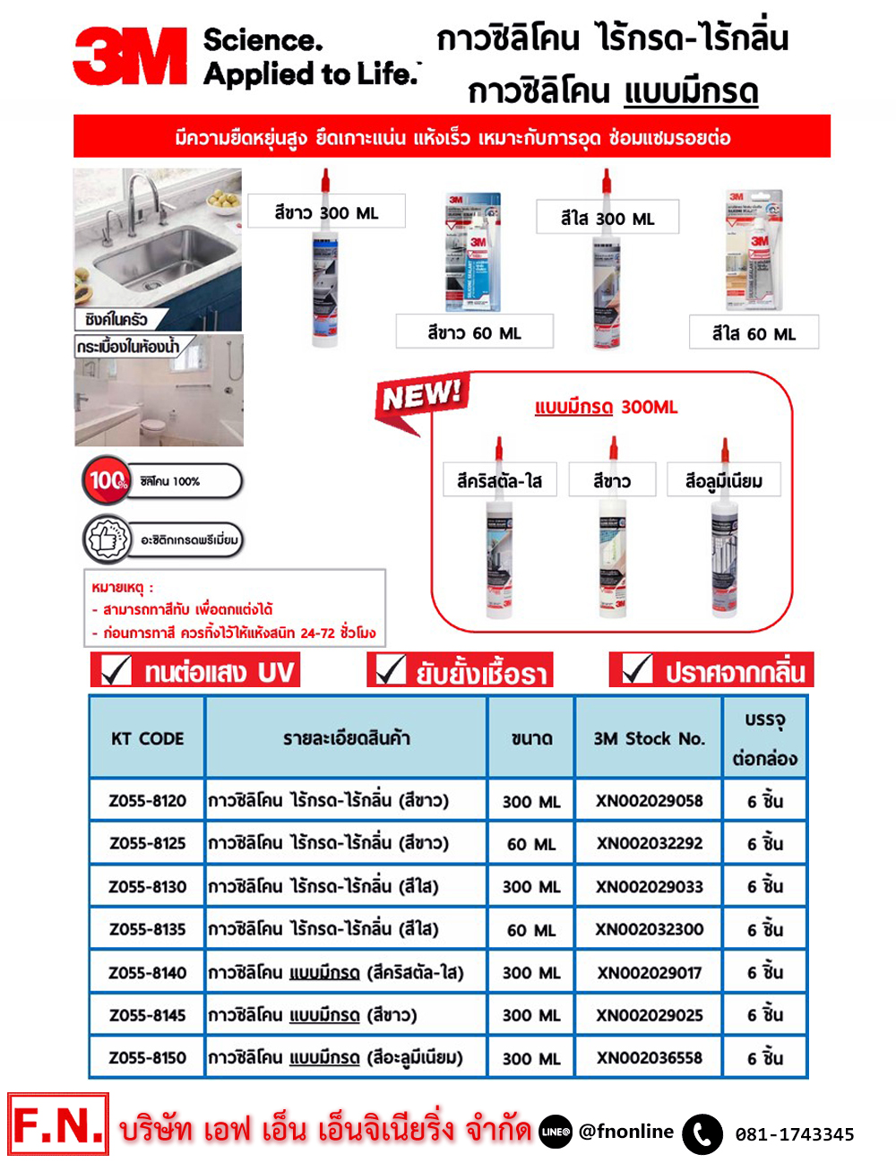 • 3M XN002029017 กาวซิลิโคน แบบมีกรด (สีคริสตัล-ใส) 300 มล. แห้งเร็ว ไม่หดตัว ยืดหยุ่นสูง