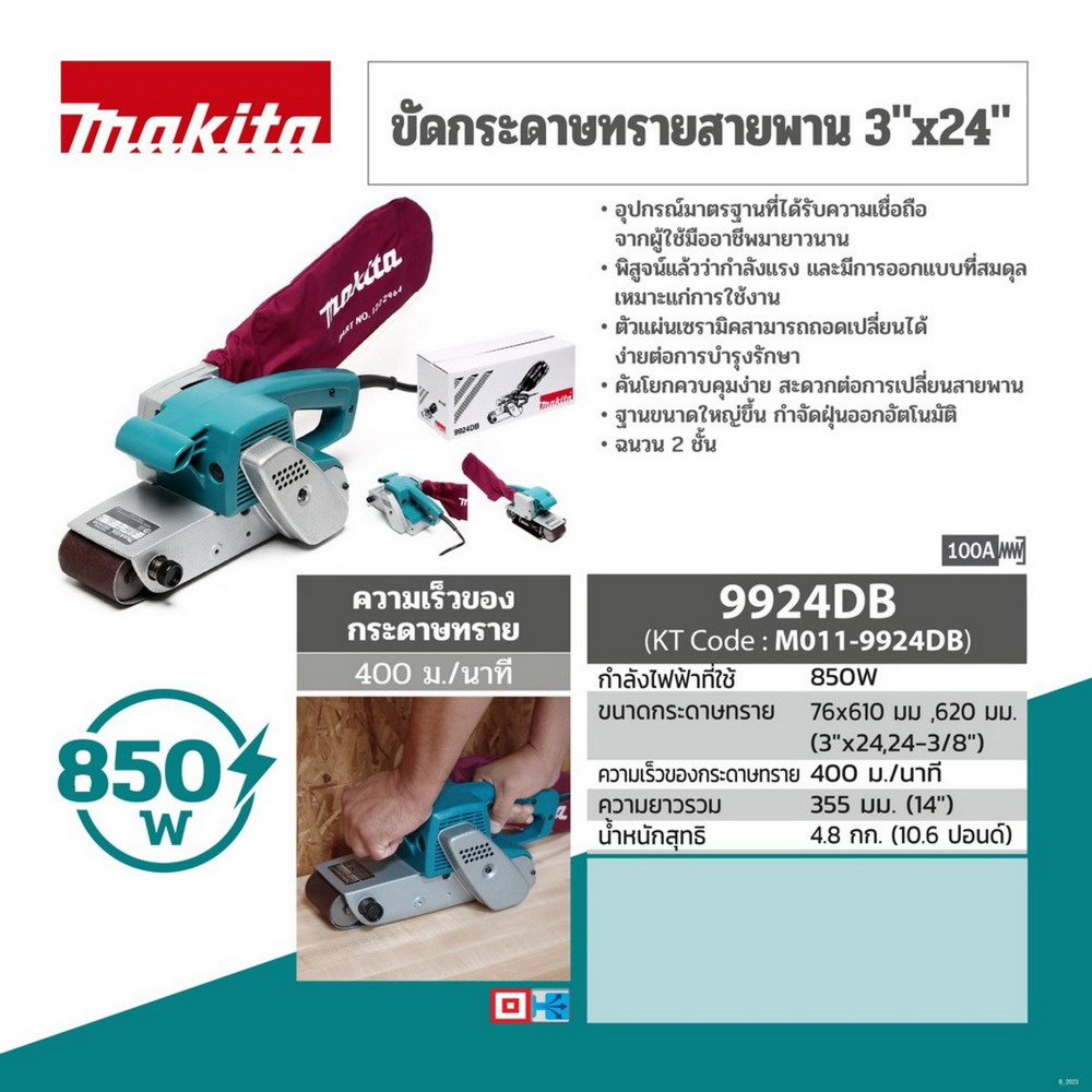 • เครื่องขัดกระดาษทรายสายพาน MAKITA กำลังไฟ 850 วัตต์ รุ่น 9924DB ขนาด 3 X24 นิ้ว มีถุงเก็บฝุ่น