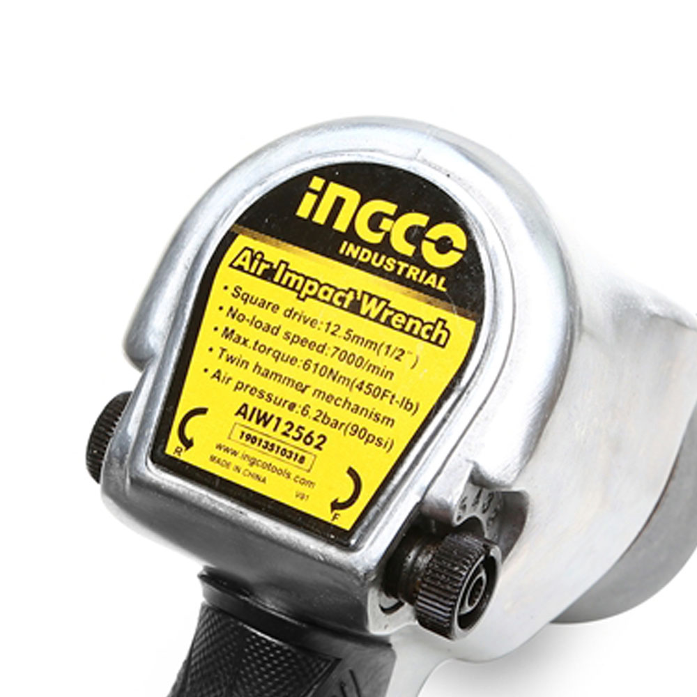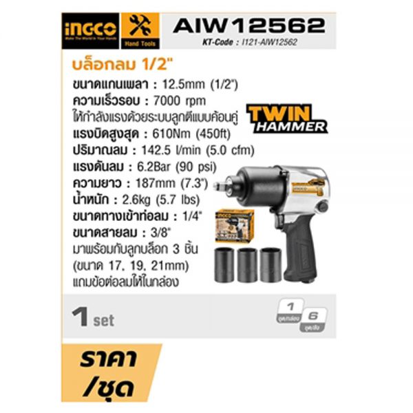 INGCO บล็อกลม ขนาด 1/2 นิ้ว รุ่น AIW12562 ความเร็วรอบ 7000 รอบ/นาที แรงบิดสูงสุด 610 รอบ/นาที แรงดันลม 6.2 บาร์ (90 PSI) ให้กำลังแรงด้วยระบบลูกตีแบบค้อนคู่ (Twin hammer)
