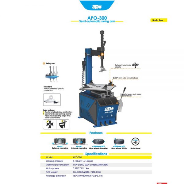 APO-300 เครื่องถอดยางรถยนต์ 1HP 220V. เส้นผ่าศูนย์กลาง 39″ จับกระทะด้านใน: 12 ~ 24 “