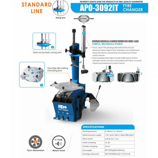 APO-3092IT เครื่องถอดยางรถยนต์ 1HP 220V. เส้นผ่าศูนย์กลาง 39″ จับกระทะด้านใน: 12 ~ 24 “(Semi-Automatic)