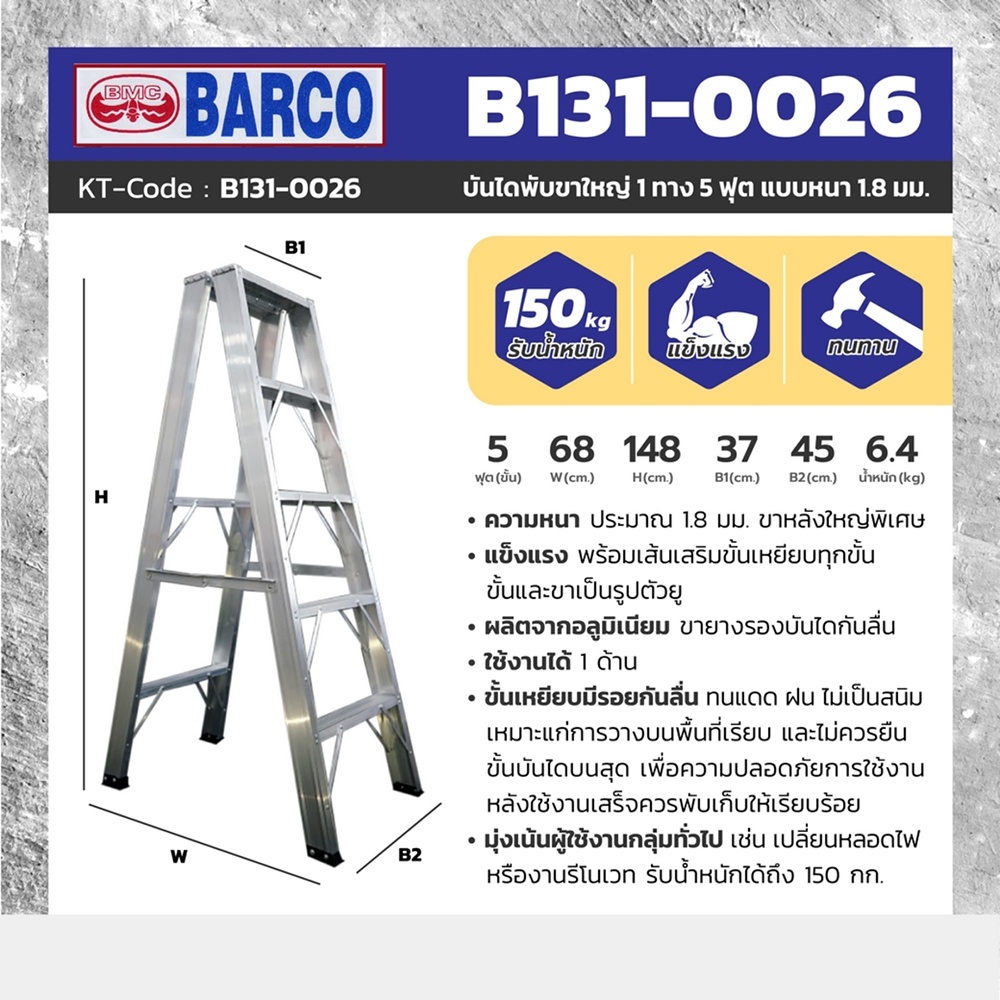BARCO บันไดพับ ขาหลังใหญ่พิเศษ 1 ทาง  ขนาด 5 ฟุต ความหนา 1.8 มม. แข็งแรง ใช้งานได้ 1 ด้าน ขั้นเหยียบมีรอยกันลื่น ทนแดด ทนฝน ไม่เป็นสนิม รับน้ำหนักได้ถึง 150 กก