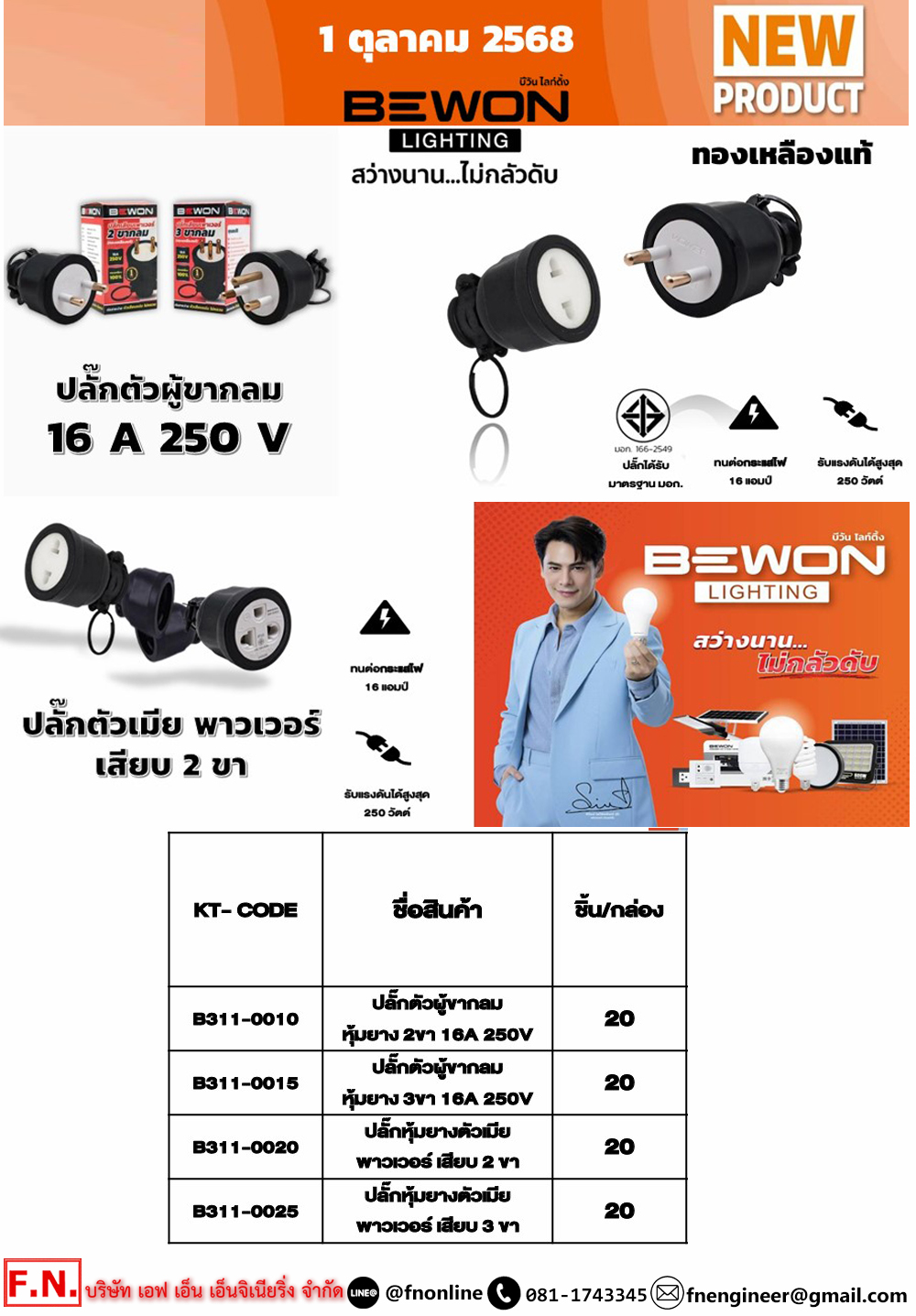 • BEWON ปลั๊กตัวผู้ขากลม หุ้มยาง 3ขา 16A 250V ขนาดสินค้า : 4.2 x 5.2 cm.