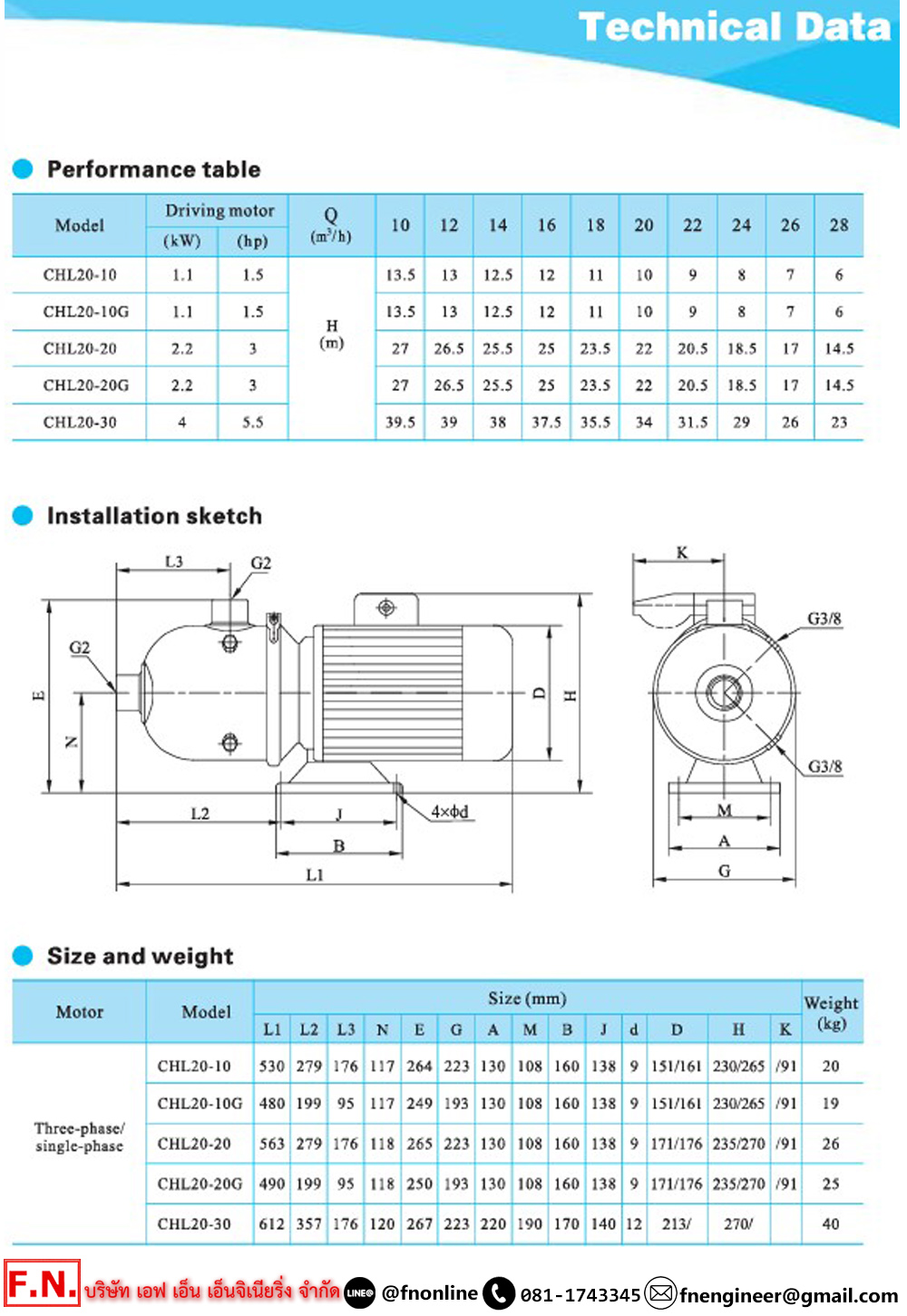 • CNP CHL20-20 ปั๊มน้ำหลายใบพัดแนวนอน 3HP 380V. ท่อส่ง 2″x 2″ ผลิตจากสแตนเลส AISI 304