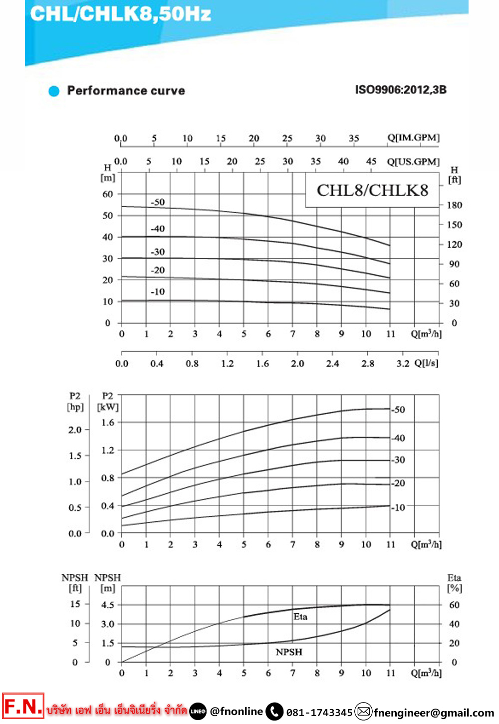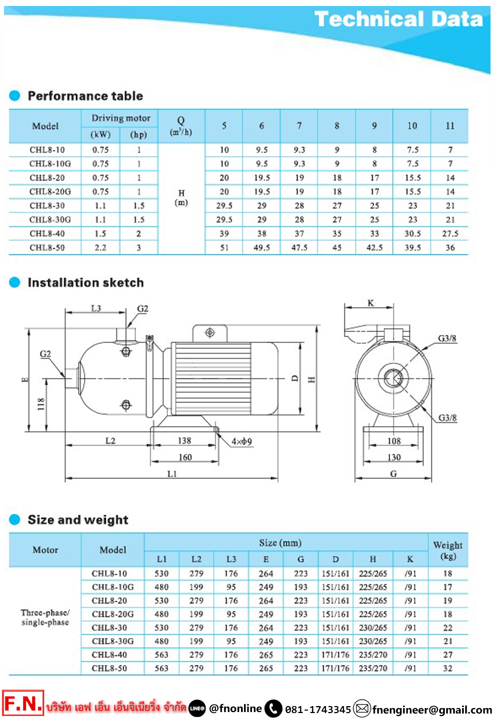 • CNP CHL8-40 ปั๊มน้ำหลายใบพัดแนวนอน 2HP 380V. ท่อส่ง 2″x 2″ ผลิตจากสแตนเลส AISI 304
