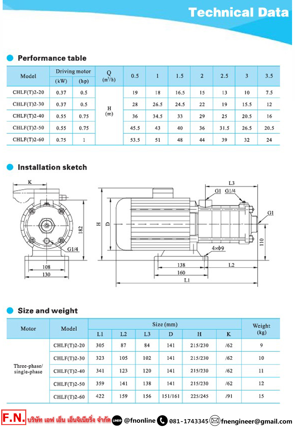 • CNP CHLF20-10 ปั๊มน้ำสแตนเลสหลายใบพัด 3HP 380V. ท่อส่ง 2″x 2″