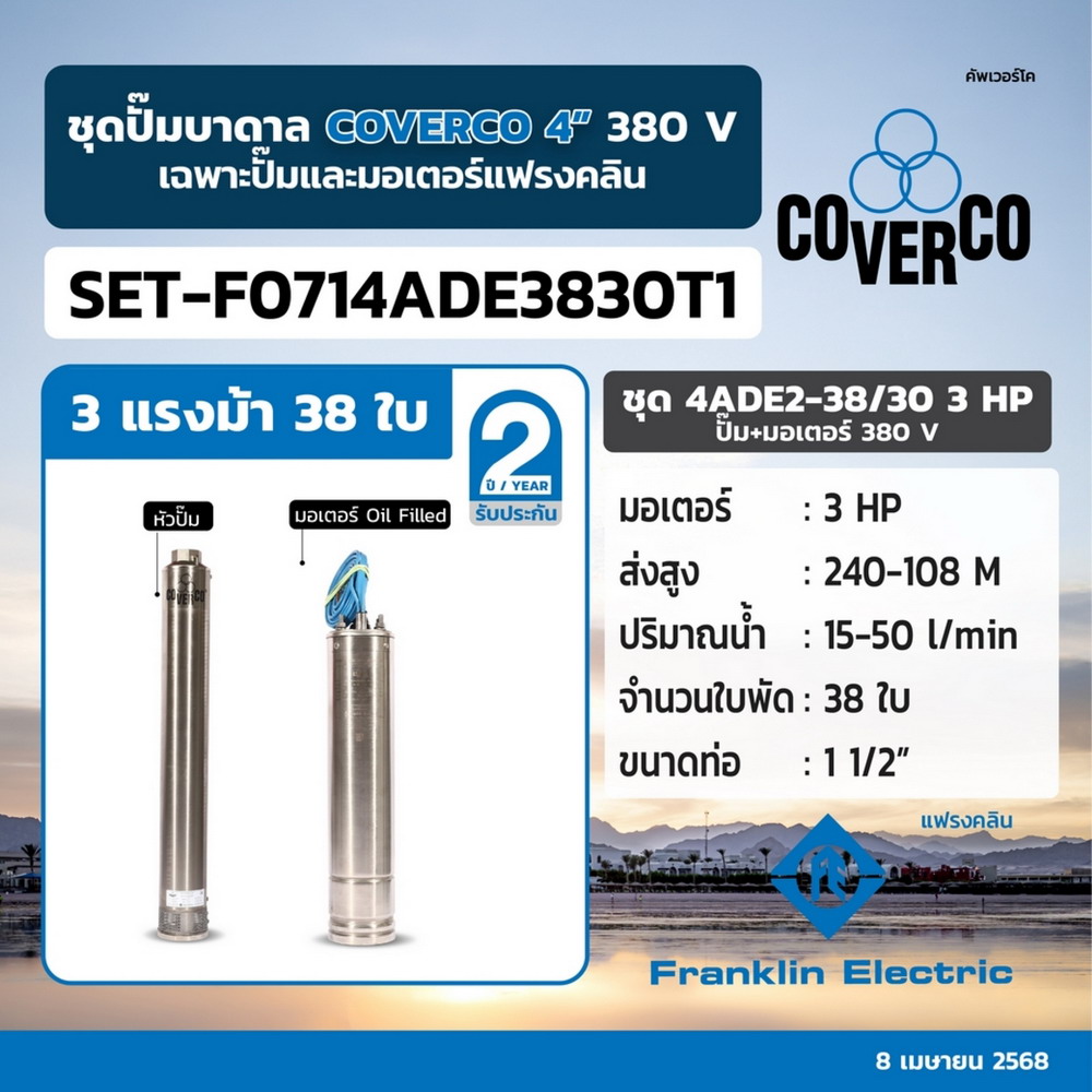 COVERCO By FRANKLIN ชุดปั๊ม+มอเตอร์ 4ADE2-38/30 3HP 380V. ท่อส่ง 1.1/2″ ไม่รวมสายไฟ ฝาบ่อ