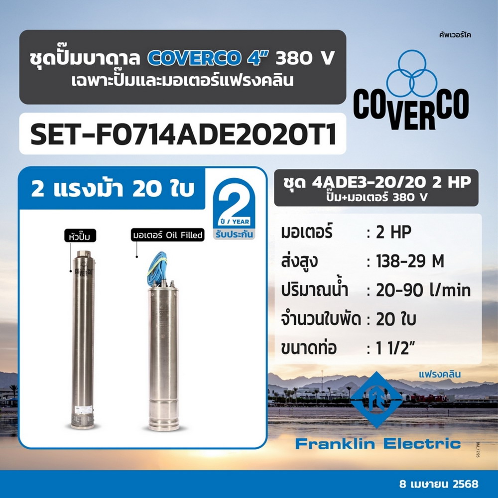 COVERCO By FRANKLIN ชุดปั๊มบาดาล 4ADE3-20/20 2HP 380V. ท่อส่ง 1.1/2″