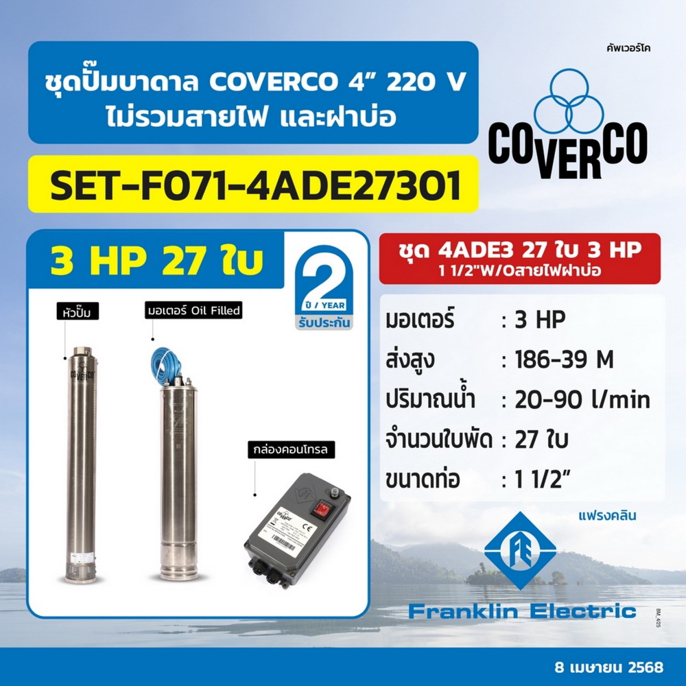 COVERCO By FRANKLIN ชุดปั๊มบาดาล 4ADE3 27ใบ 3 HP 220V. ท่อส่ง 1.1/2″ ไม่รวมสายไฟและฝาบ่อ