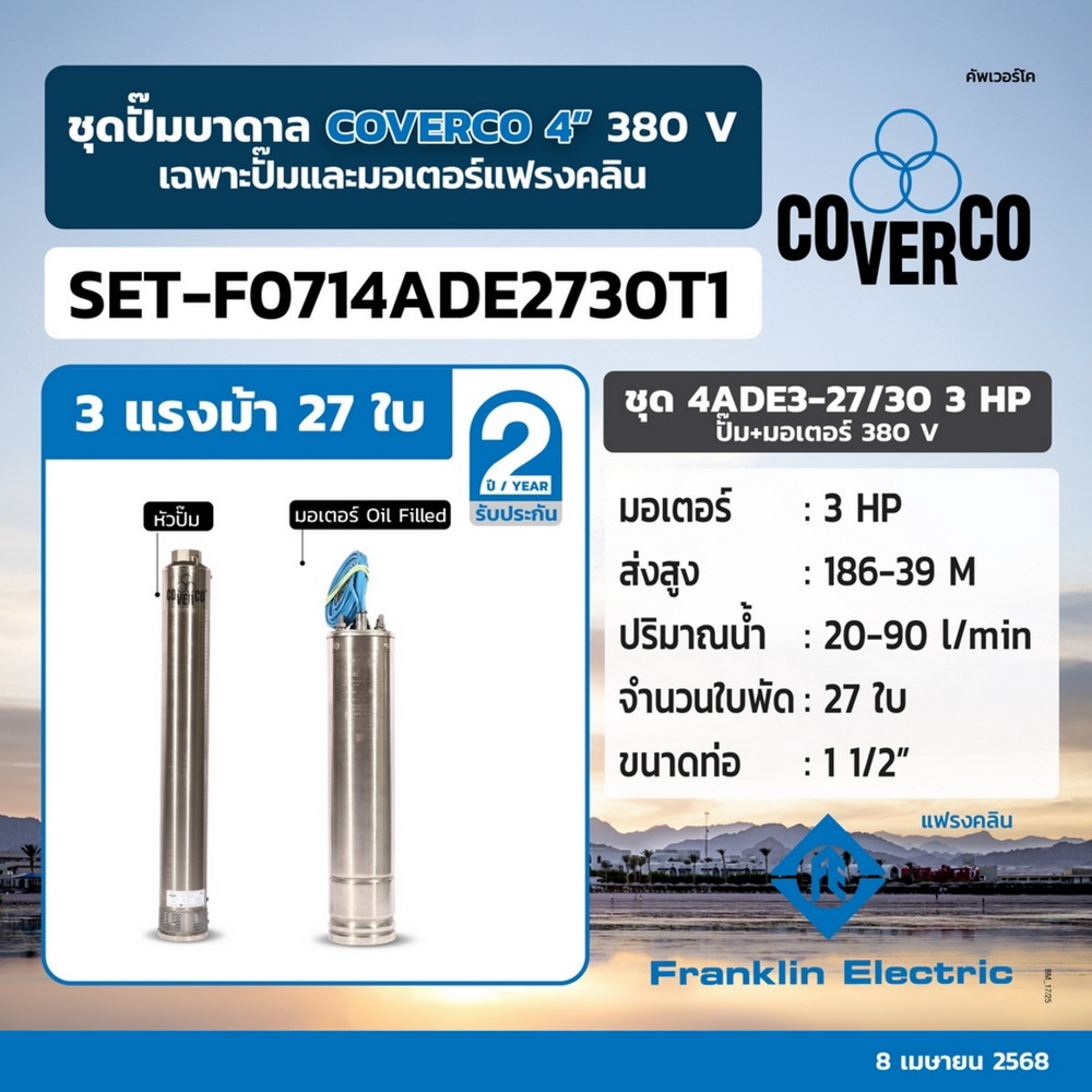 COVERCO By FRANKLIN ชุดปั๊มบาดาล 4ADE3-27/30 3HP 380V. ท่อส่ง 1.1/2″ ไม่รวมสายไฟ ฝาบ่อ