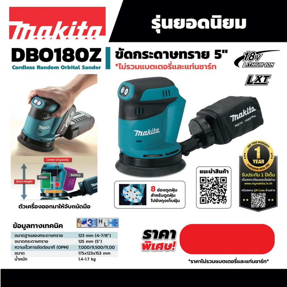 MAKITA DBO180 เครื่องขัดกระดาษทรายไร้สาย 18V.125MM. (5″) ไม่รวมแบตเตอรี่และแท่นชาร์จ
