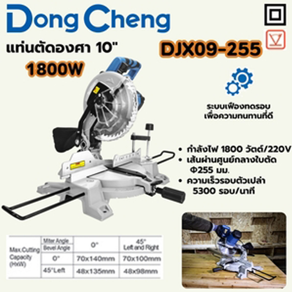 DONG CHENG แท่นตัดองศา 10 นิ้ว รุ่น DJX09-255 กำลังไฟ 1,800W. ระบบเฟืองทดรอบ ความเร็วรอบตัวเปล่า 5,300 รอบ/นาที เส้นผ่าศูนย์กลางใบตัด 25.4 มม.