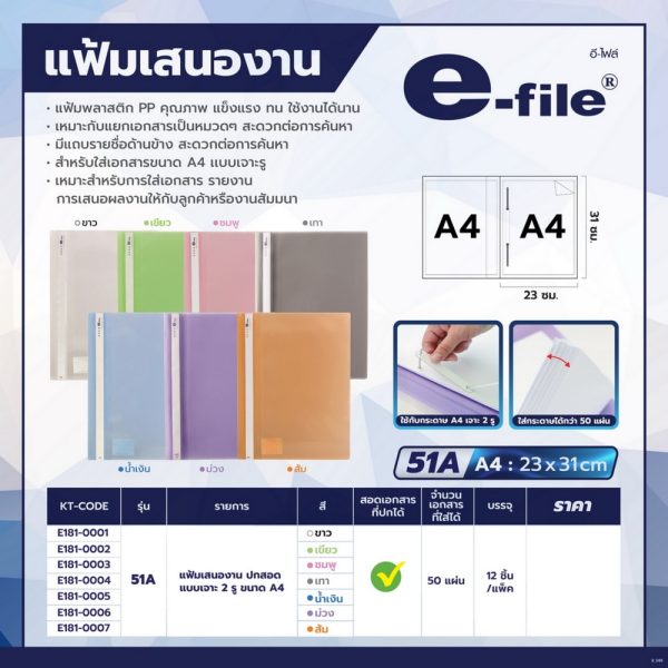 E-FILE แฟ้มเสนองาน ปกสอด ขนาด A4 รุ่น 51A สีขาว แบบเจาะ 2 รู ผลิตจากพลาสติก PP ใส่เอกสารได้ 50 แผ่น บรรจุ 12 ชิ้น/แพ็ค