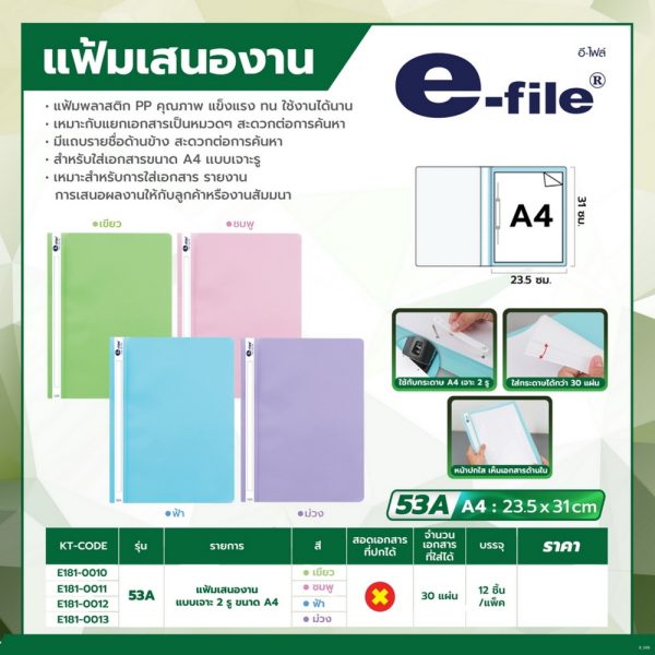 E-FILE แฟ้มเสนองาน ขนาด A4 รุ่น 53A สีม่วง แบบเจาะ 2 รู ปกผลิตจากพลาสติก PP ใส่เอกสารได้ 30 แผ่น บรรจุ 12 ชิ้น/แพ็ค