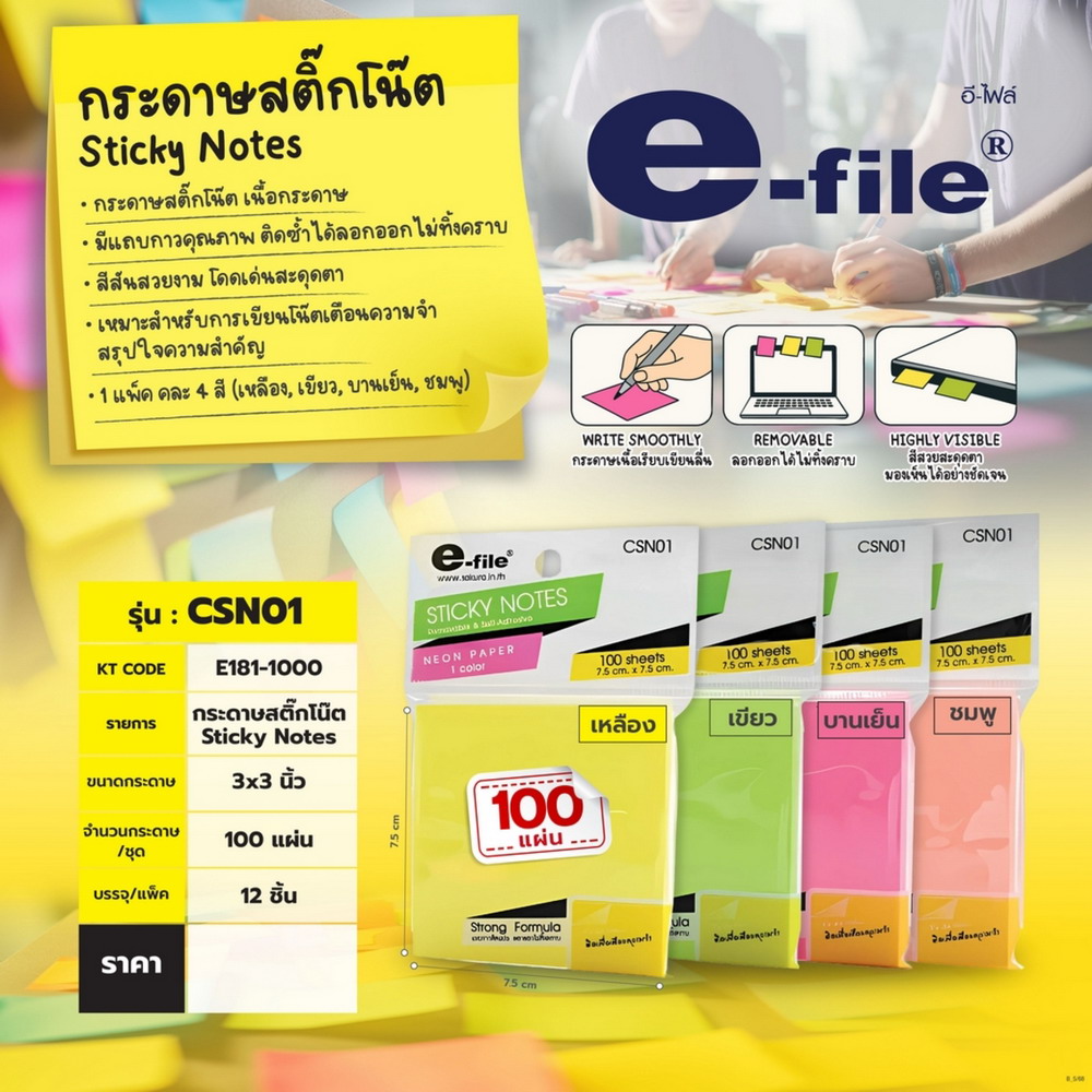 • กระดาษสติ๊กโน๊ต (คละสี) E-FILE รุ่น CSN01 ขนาด 3 X 3 นิ้ว (12 ชิ้น/แพ็ค)
