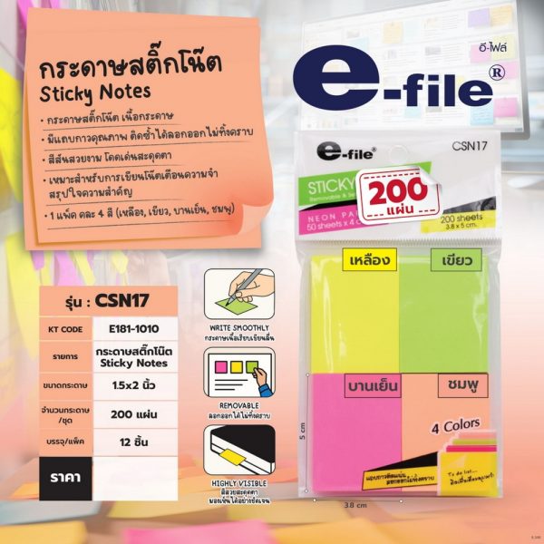 E-FILE กระดาษสติ๊กโน๊ต (คละสี) รุ่น CSN17 ขนาด 1.5 X 2 นิ้ว จำนวนกระดาษ 200 แผ่น/ชุด แถบกาวคุณภาพ ติดซ้ำได้ ลอกออกไม่ทิ้งคราบ บรรจุ 12 ชิ้น/แพ็ค