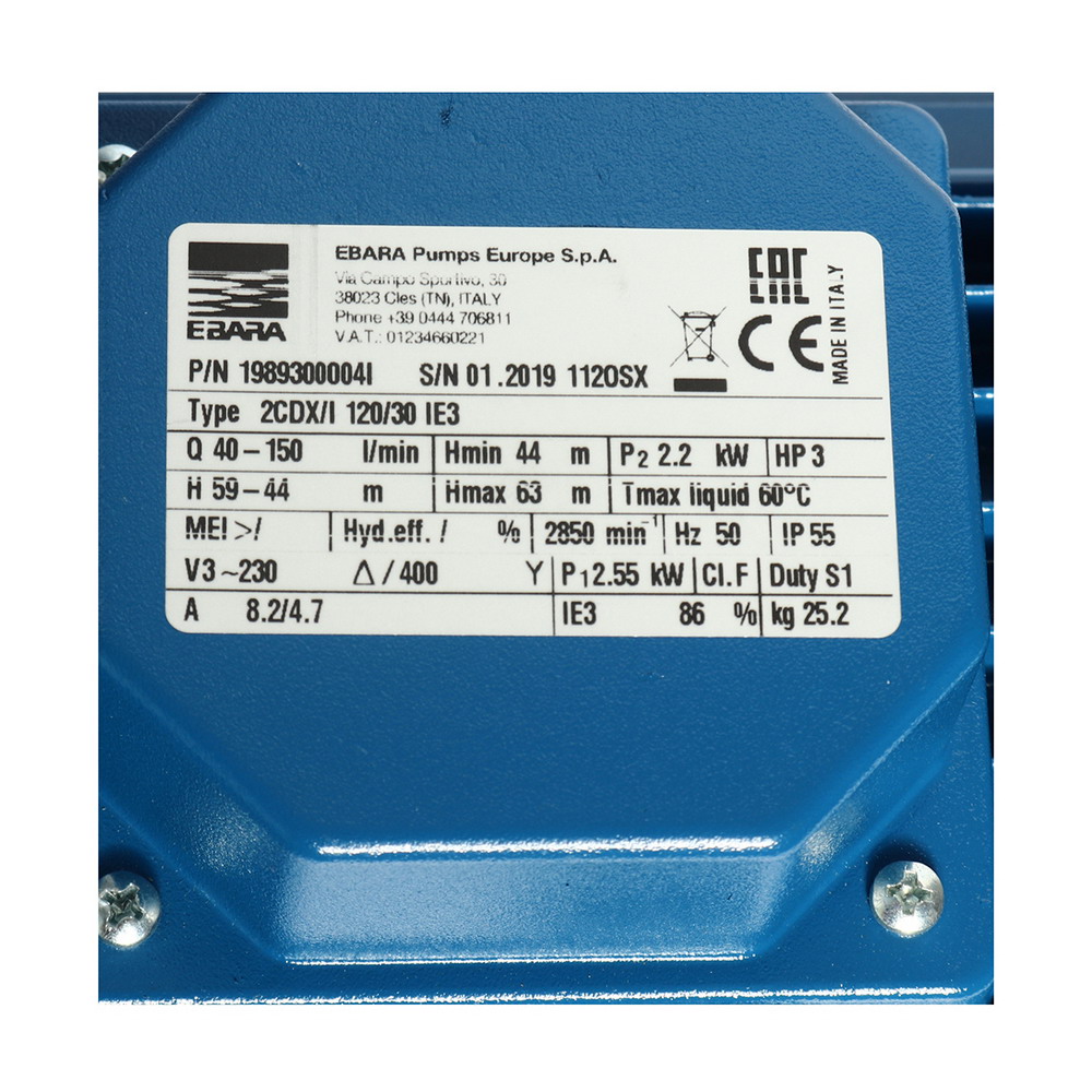 EBARA 2CDX-120/30 ปั๊มน้ำหอยโข่ง SS304 ใบพัดคู่ 3.0HP 380V. ท่อส่ง 1.1/4″ X 1″