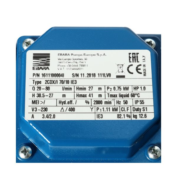 EBARA 2CDX-70/10 ปั๊มน้ำหอยโข่ง SS304 ใบพัดคู่ 1HP 380V. ท่อส่ง 1.1/4″ X 1″