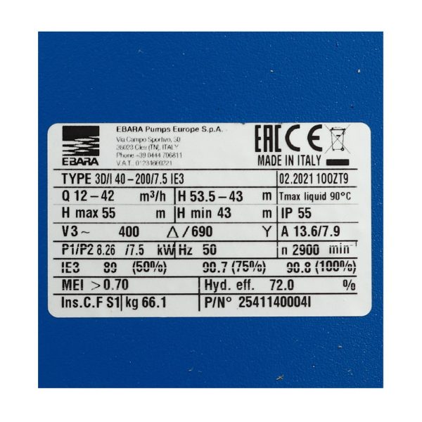 EBARA 3D 40-200/7.5 ปั๊มหอยโข่งเหล็กหล่อ 10HP 380V ท่อดูด 2.1/2 นิ้ว ท่อส่ง 1.1/2 นิ้ว