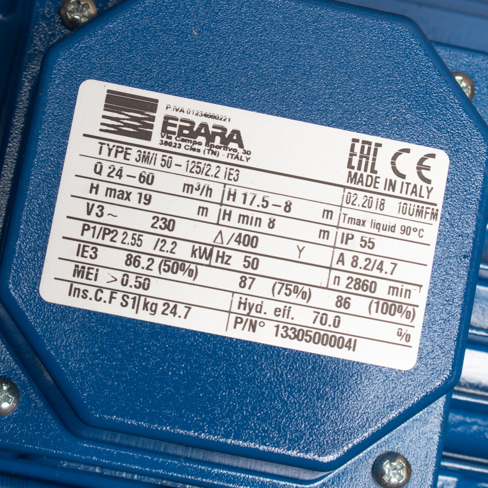 EBARA 3M 50-125/2.2 ปั๊มน้ำหอยโข่งแสตนเลส 3HP 380V. ท่อส่ง 2.1/2″ x 2”