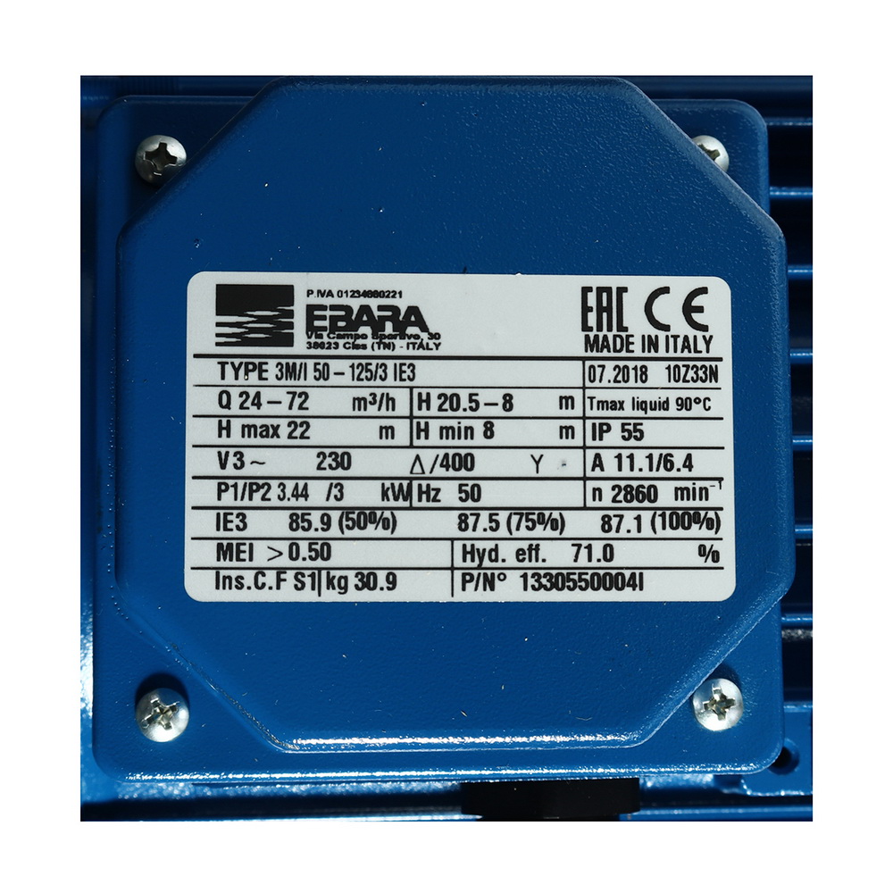 EBARA 3M 50-125/3.0 ปั๊มน้ำหอยโข่งแสตนเลส 4HP 380V. ท่อส่ง 2.1/2″ x 2” (ไม่รวมหน้าแปลน)