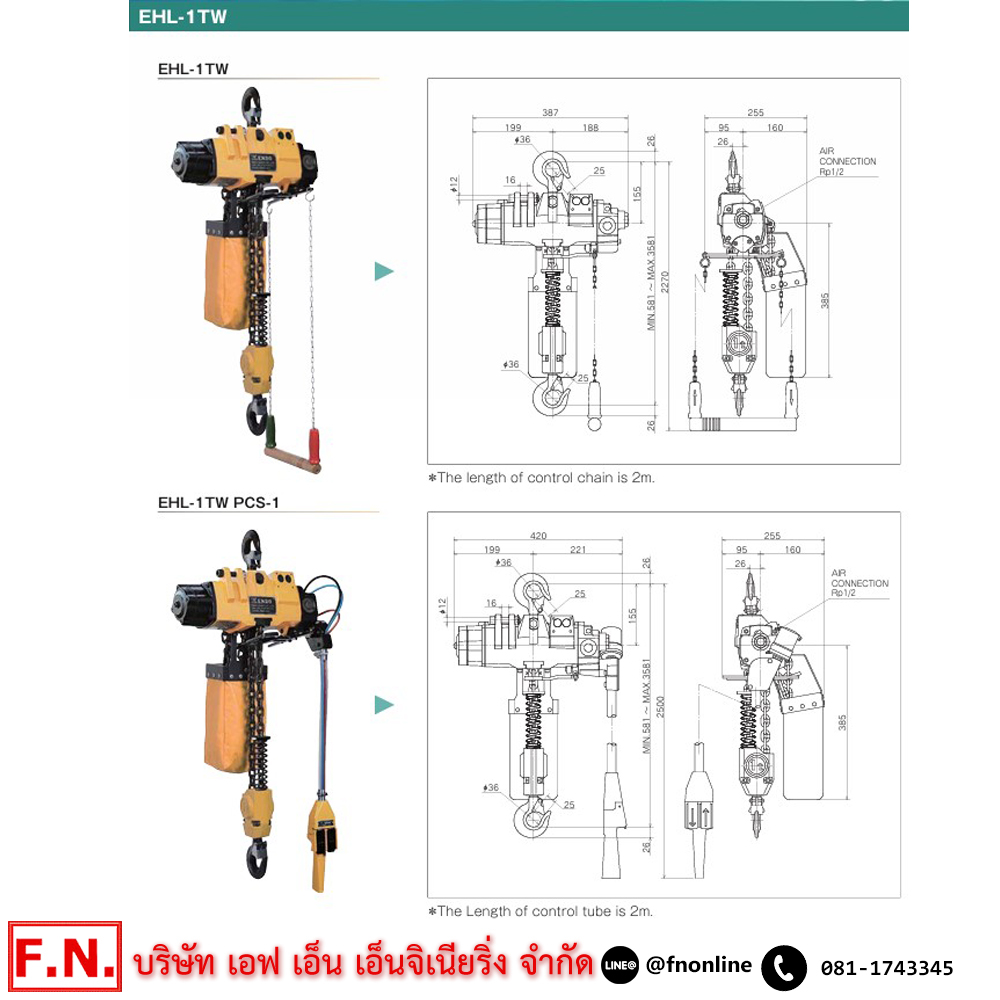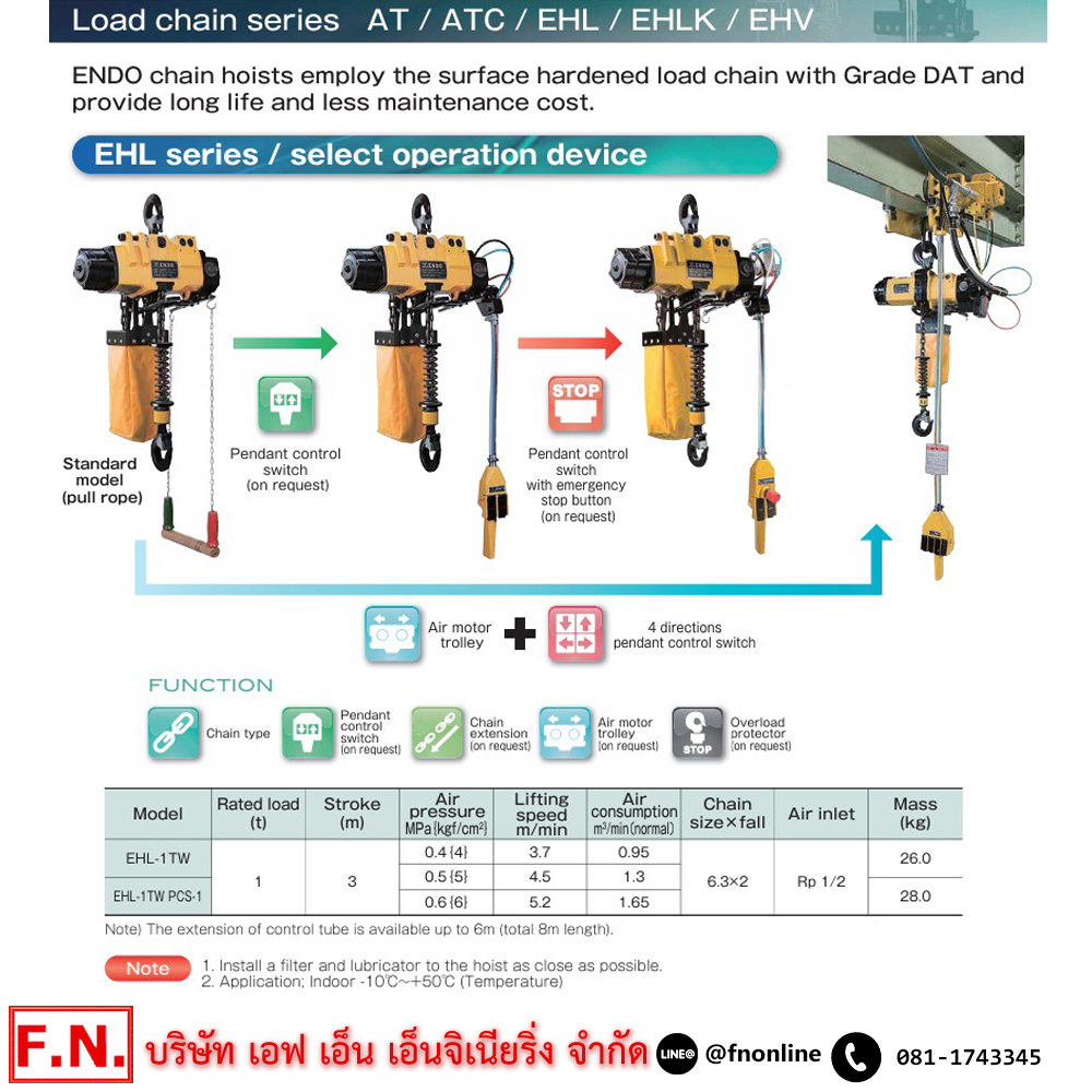ENDO EHL-1TW รอกโซ่ลม รุ่นมาตรฐาน ระยะยก 3M. สามารถยก 1 TON