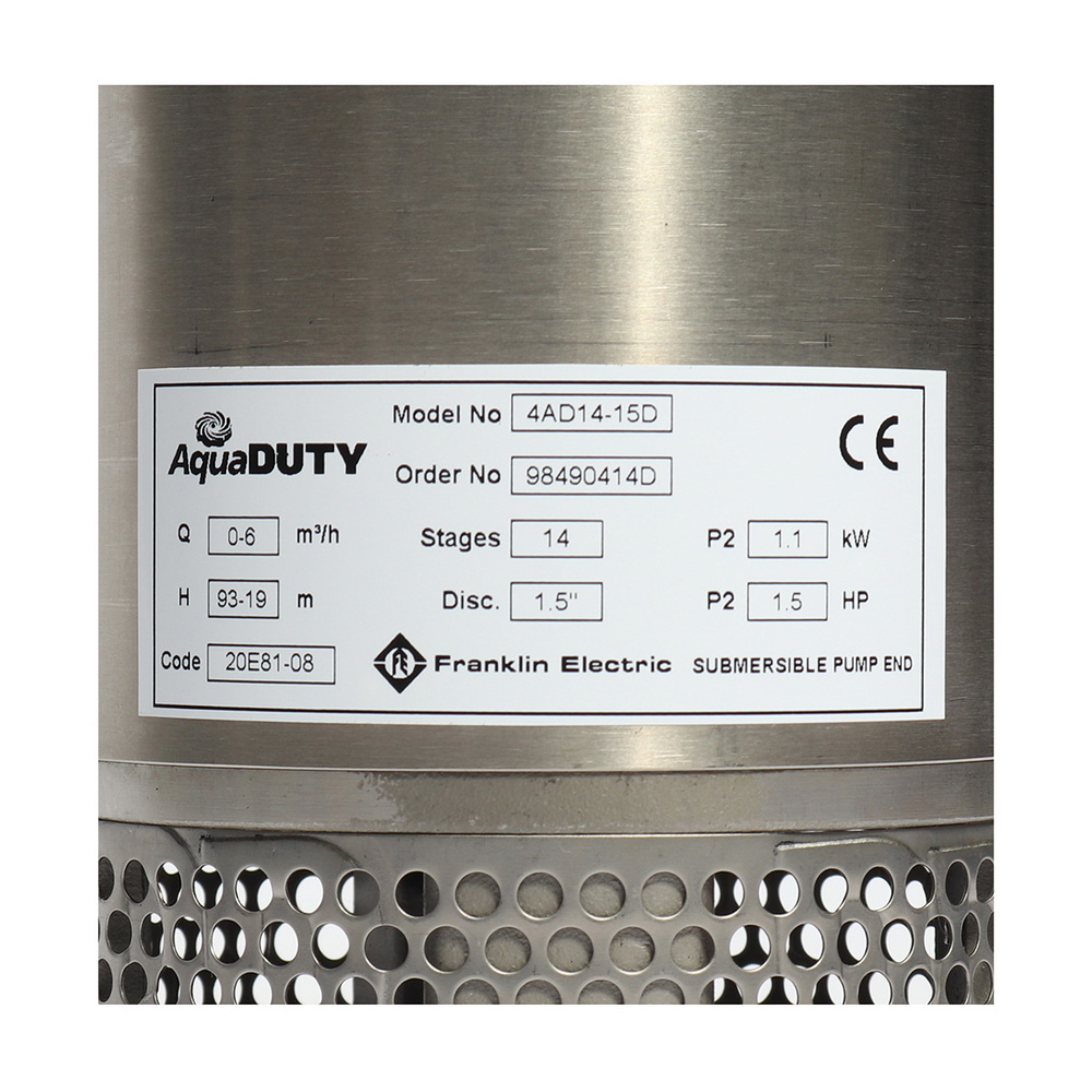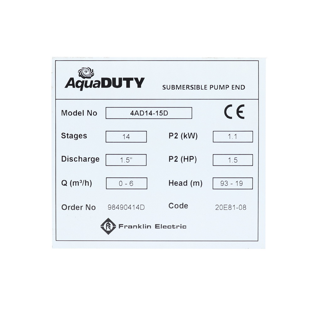 FRANKLIN เฉพาะหัวปั๊มบ่อบาดาล AquaDUTY รุ่น 4AD14-15D ขนาด 4 นิ้ว ท่อส่งออก 1.5 นิ้ว กำลังมอเตอร์ 1.5 แรงม้า ส่งสูง 76-19 เมตร ปริมาณน้ำ 50-100 ลิตร/นาที 14 ใบพัด พร้อมเช็ควาล์วในตัว ไม่รวมมอเตอร์