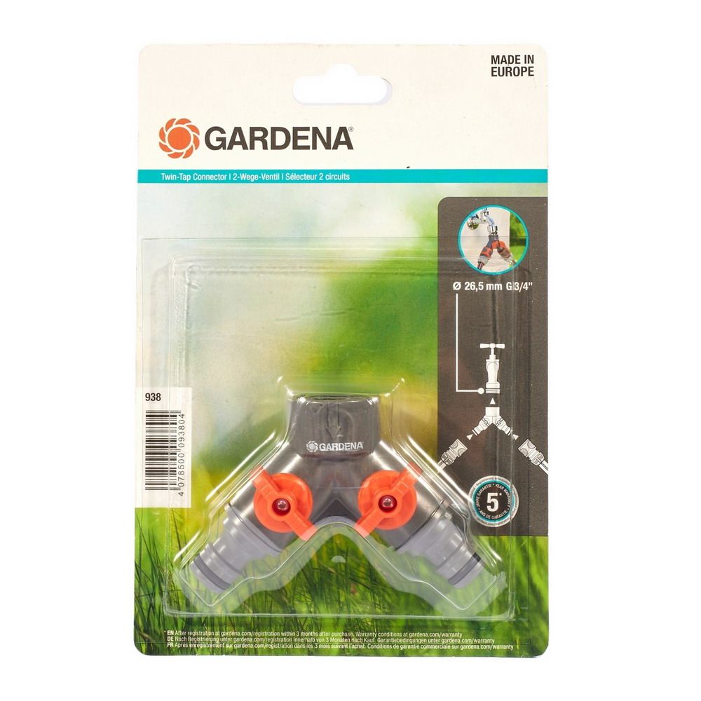 GARDENA 00938-20 ข้อต่อก๊อกน้ำหัวแยกสองทาง สำหรับก๊อกน้ำ 1/2 ที่มีเกลียว 3/4
