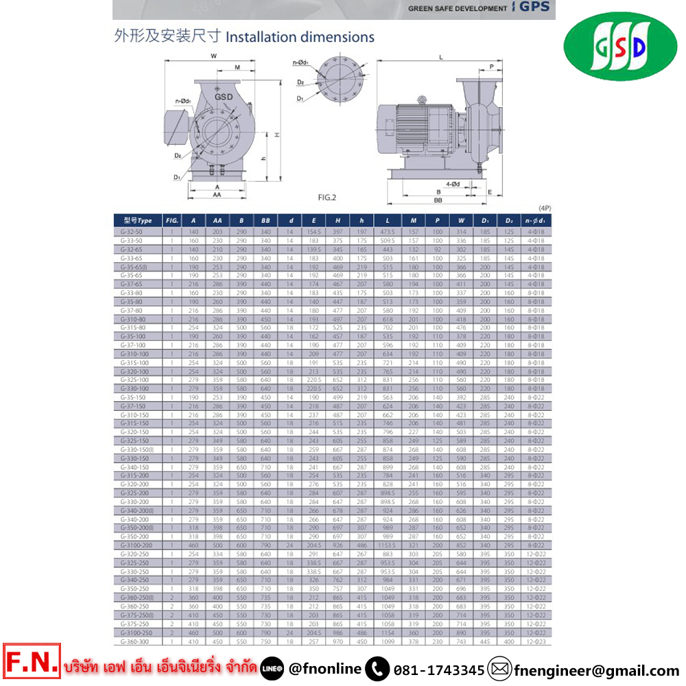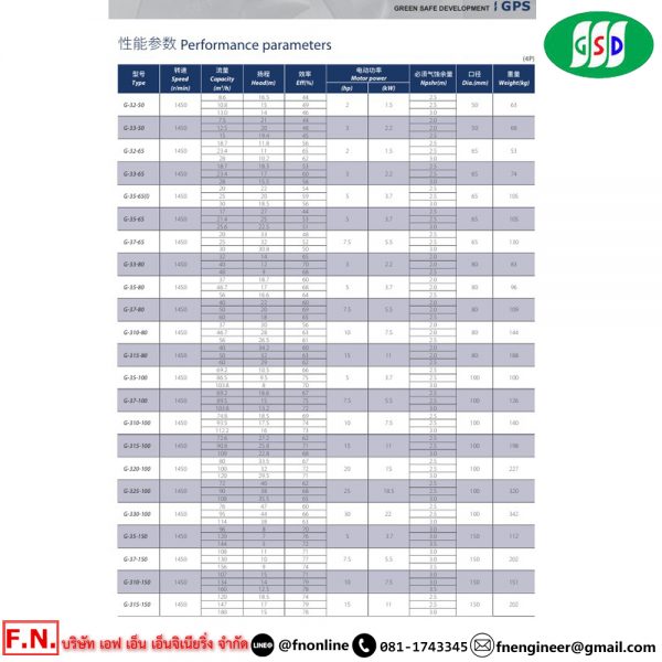 GPS G37-100-4P ปั๊มน้ำหอยโข่ง 7.5HP.380V.4Pole ท่อ 100MM. ความสามารถ 69.2∼103.8M³/H ส่งสูง 16.6∼13.2M.