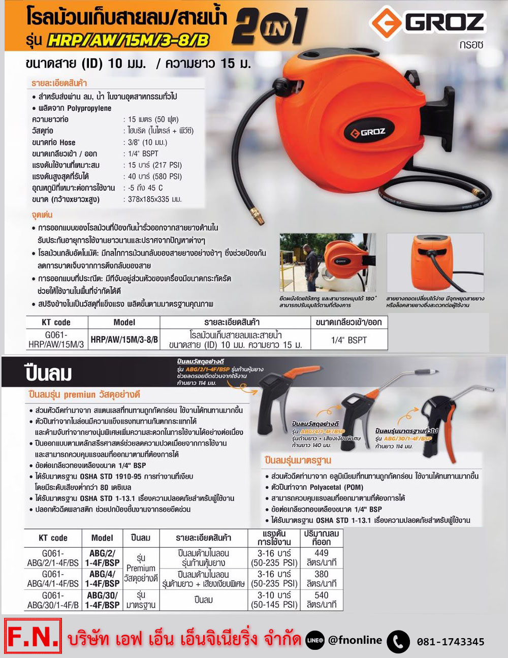 GROZ ปืนลมด้ามไนลอน ก้านยาว 114 มม. รุ่น ABG/2/1-4F/BSP ข้อต่อเกลียวทองเหลืองขนาด 1/4″ BSP แรงดันลม 3-16 บาร์ แรงลมที่ออก 449 ลิตร/นาที เสียงเงียบ แข็งแรง ทนทาน