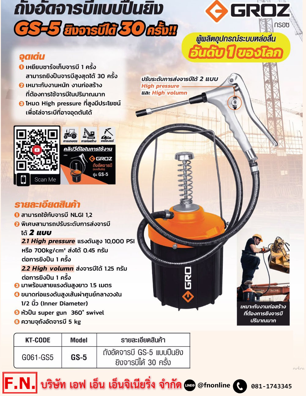 GROZ ถังอัดจาระบี รุ่น GS-5 รุ่นงานหนัก ความจุถังอัดจาระบี 5 กก. ส่งจาระบีได้ 1.25 กรัมต่อการยิงปืน 1 ครั้ง เหยียบชาร์จ 1 ครั้ง ยิงสูงสุดได้ 30 ครั้ง สายแรงดันยาว 1.5 เมตร