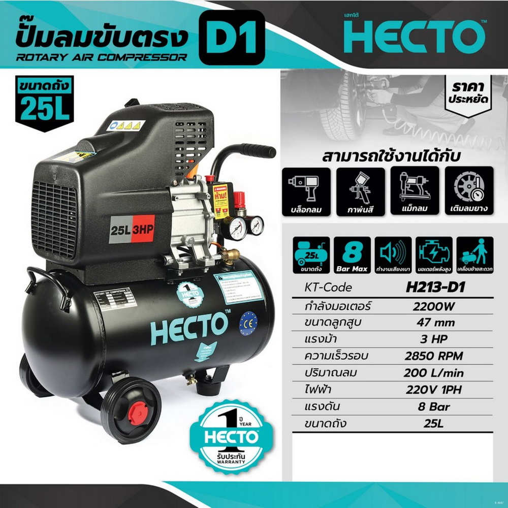 • HECTO D1 ปั๊มลมขับตรง 3HP 220V. ถัง 25 ลิตร ความเร็วรอบ 2,850 รอบ/นาที ปริมาณลม 200 ลิตร/นาที