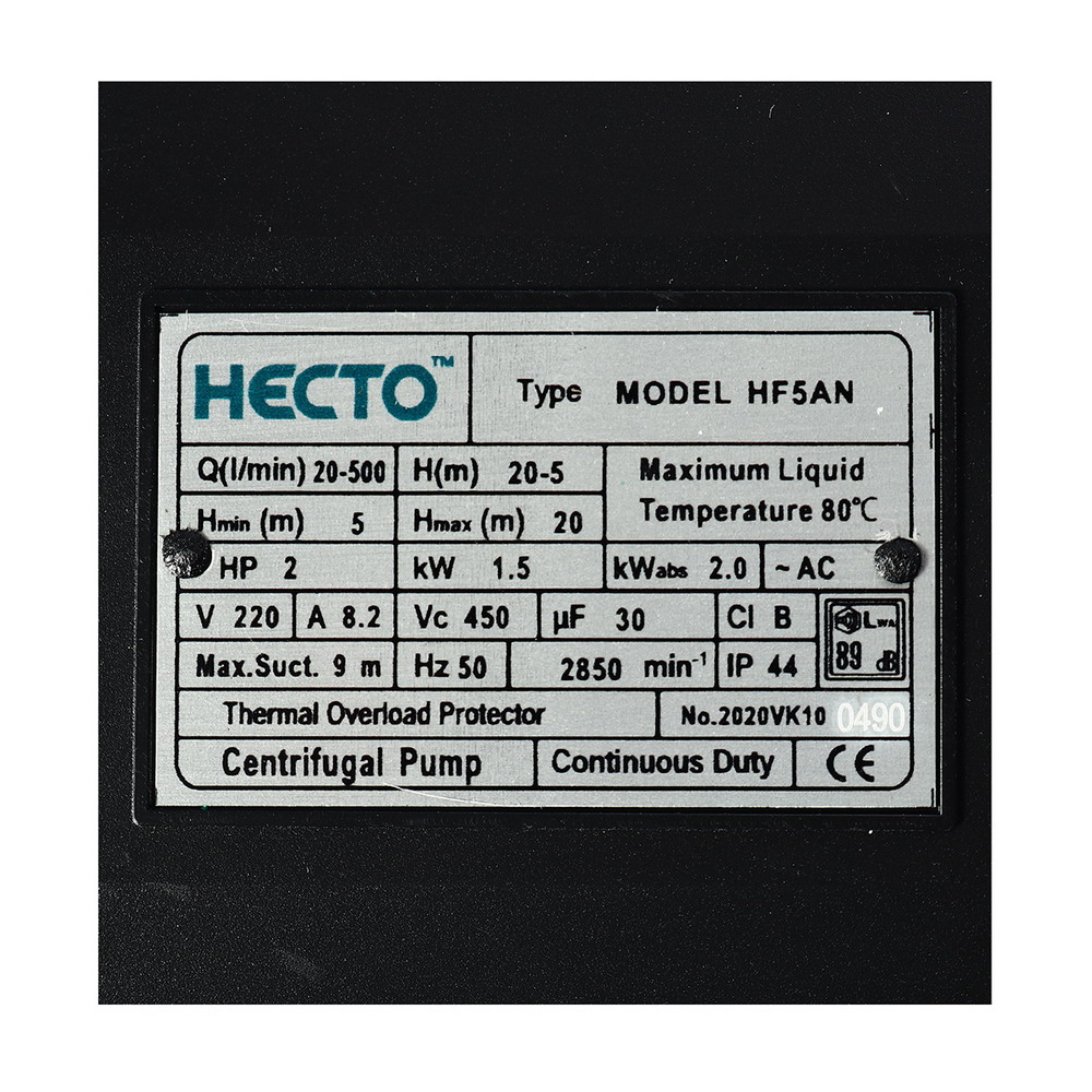 HECTO HF5AN ปั๊มหอยโข่ง 2HP 220V. ท่อ 2X2 นิ้ว ปริมาณน้ำ 20-500 ลิตร/นาที ระยะส่งไกลสุด 20-5 เมตร