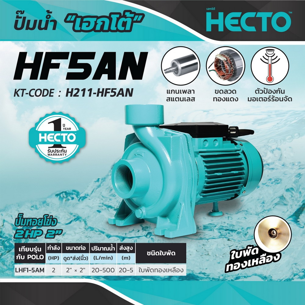 • HECTO HF5AN ปั๊มหอยโข่ง 2HP 220V. ท่อ 2X2 นิ้ว ปริมาณน้ำ 20-500 ลิตร/นาที ระยะส่งไกลสุด 20-5 เมตร