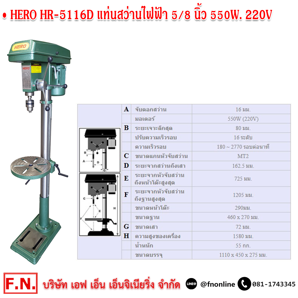 HERO HR-5116D แท่นสว่านไฟฟ้า 5/8 นิ้ว 550W. 220V. ความเร็วรอบ 180~2770 รอบต่อนาที