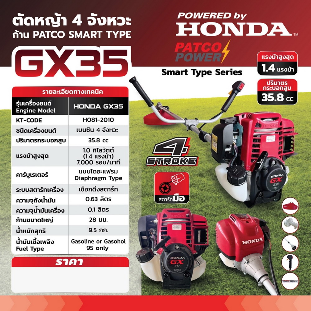 HONDA GX35 เครื่องตัดหญ้า 4 จังหวะ ก้าน PATCO SMART TYPE 1.4 แรงม้า กระบอกสูบ 35.8 ซีซี ความจุถังน้ำมัน 0.63 ลิตร