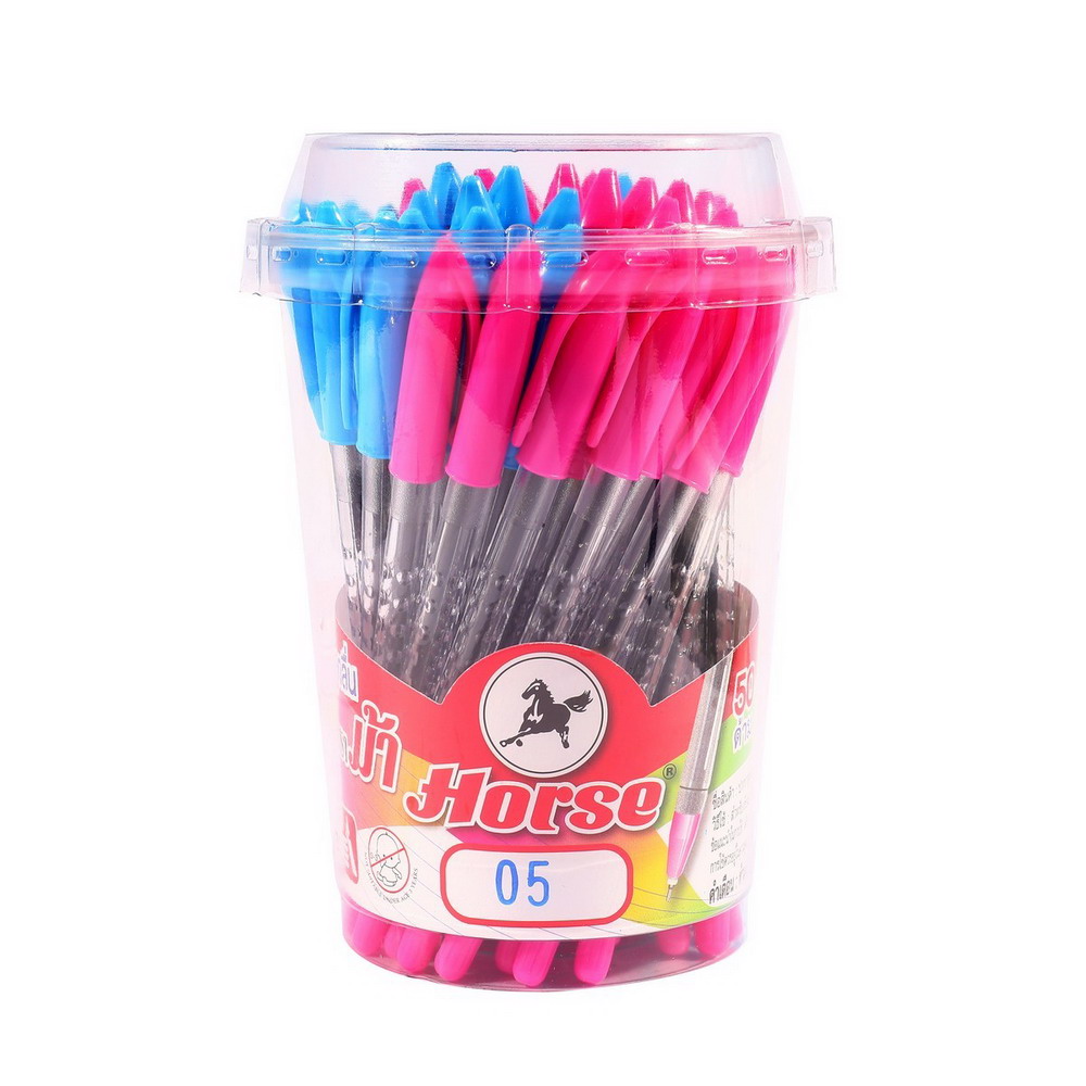 HORSE ปากกาลูกลื่นสีน้ำเงิน แบบปลอก หัวปากกา 0.5 มม. รุ่น H-05 เขียนได้ไหลลื่น ไม่ขาดตอน สะดวกพกพา บรรจุ 50 ด้าม/กระป๋อง