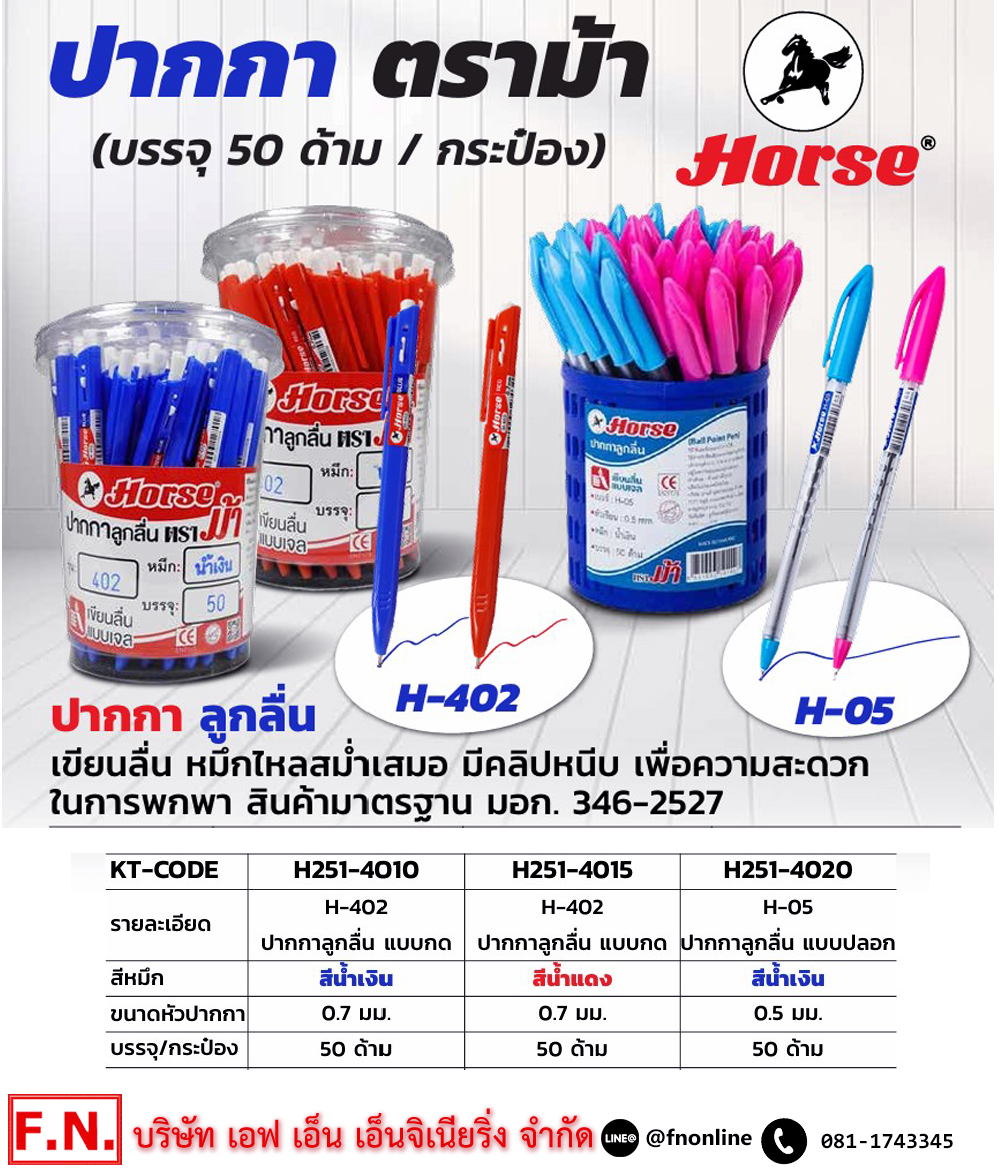 • ปากกาลูกลื่นแบบปลอก คุณภาพดี ตราม้า