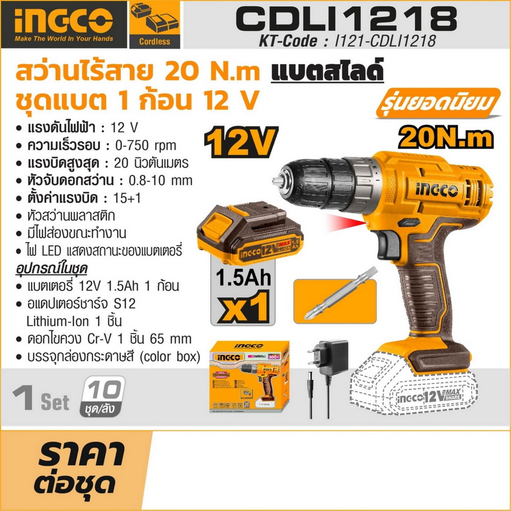 INGCO CDLI1218 สว่านไร้สาย 12V หัวจับดอกสว่าน 10MM. ความเร็วรอบ 0-750 RPM รวมแบตและแท่นชาร์จ